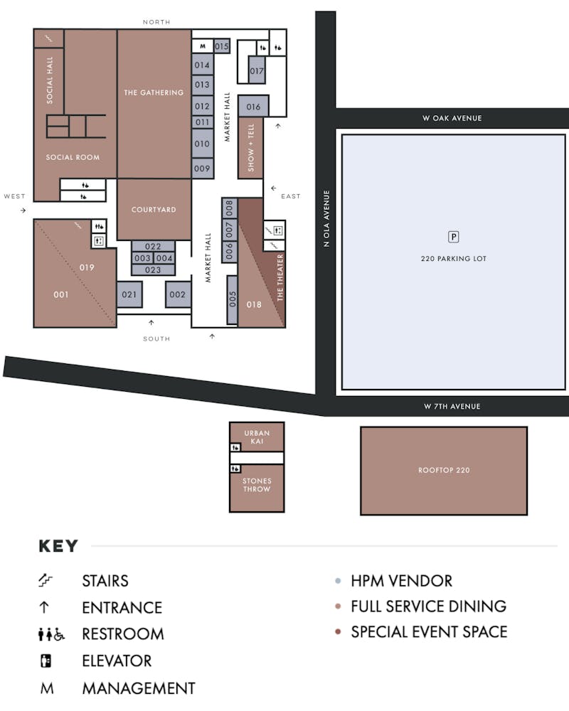 First Floor: 001 Oak + Ola 002 Graze 1910 003 Zukku 004 Ling's Dumplings 005 Bar AW 006 The Fold 008 Buddy Brew 010 Coming Soon 011 Fit Bowl 012 Empamamas 013 Dalmoros 014 Muchachas | 015 Kipos 016 Hemingway's 017 Coming Soon 018 Steelbach 021 Chill Bros 022 Champagne Porch 023 Han Handrolls Second Floor 019 M.bird |